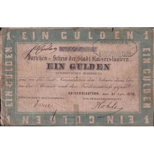 Obverse lettering 1 EIN GULDEN 1 No. XXXX Darlehen-Schein der Stadt Kaiserslautern EIN GULDEN SÜDDEUTSCHER WAEHRUNG wird von der Stadt Kaiserslautern dem Inhaber dieses Schei- nes drei Monate nach dem Friedensschluß gezahlt. KAISERSLAUTERN, den 31.Juli 1870. UNTERSCHRIFT DES CASSIRERS: DAS BÜRGERMEISTERAMT: