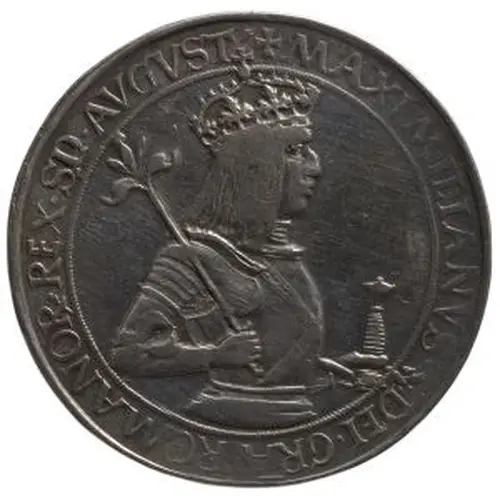 | توضیحات روی سکه | Half-length portrait of Maximilian facing right, wearing a crown and armor, with his right hand resting on a lily scepter and his left hand holding a sword at the cross-guard; surrounded by a pearl circle |