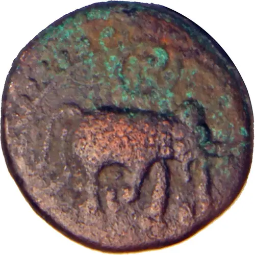 | توضیحات روی سکه | In linear circle, surrounded by circle of dots, elephant to left with uplifted tail, Kannada `LA` above |