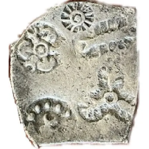 | Obverse description | Punchmark numbers per Gupta and Hardaker: 394 (six-armed variant), 467 (sun with oblique rays), 297 (three fishes facing a circle), 180 (taurine surrounded by half circle below and dots above), 3 (centipede?). |