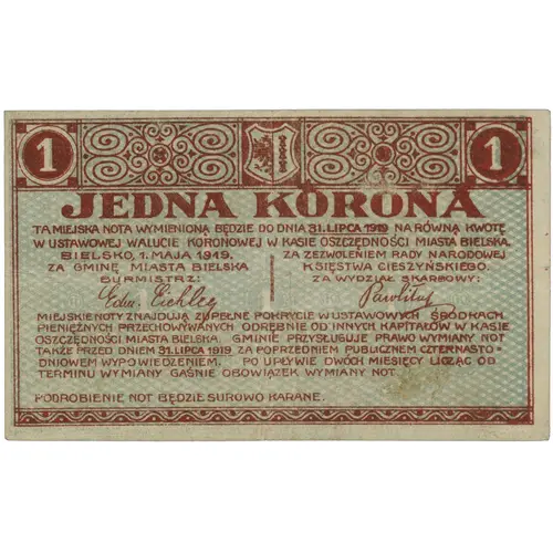 JEDNA KORONA Ta miejska nota wymienioną bęndzie do dnia 31. Lipca 1919 na równą kwotę w ustawowej walucie Koronowej w Kasie Oszczędności Miasta Bielska. Bielsko, I Maja 1919, za gminę Miasta Bielska Burmistrz: Za zezwoleniem Rady Narodowej Księstwa Cieszyńskiego. za wydział skarbowy: (Translation: ONE CROWN This city note will be exchanged until July 31, 1919 for an equal amount in statutory Crown currency in the savings bank of the city of Bielsko. Bielsko, I May 1919, for the community of the City of Bielsko Mayor: With the permission of the National Council of the Duchy of Cieszyn. for the tax department:) |