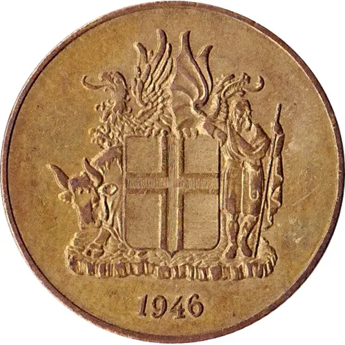 | Obverse description | Icelandic coat of arms surrounded by the four traditional protector spirits (`Landvættir`) of Iceland. These are Griðungur the bull, Gammur the eagle, Dreki the dragon, and Bergrisi the giant. |