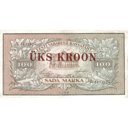 | Obverse lettering | EESTI VABARIIGI KASSATÄHT ÜKS KROON 100 SADA MARKA (Translation: Treasury Note of the Republic of Estonia One Kroon Hundred Marka) |