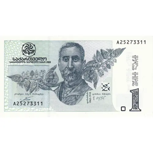 | Opis awersu | Borjgali at upper left center Grapes and wine leaves, portrait of Niko Pirosmanashvili in the center. Value at the right. Serial numer with mandatory A - prefix at the left down an right upper corners |