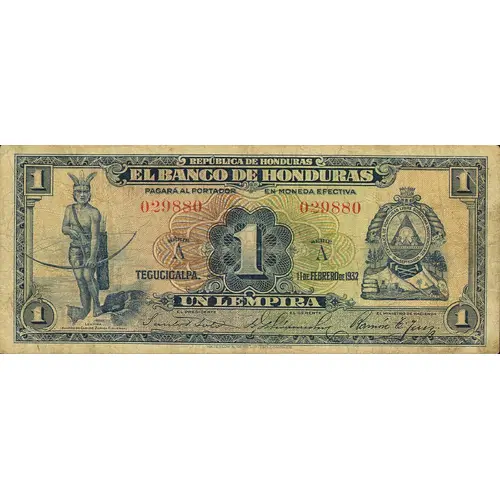 | Ön yüz lejandı | REPÚBLICA DE HONDURAS EL BANCO DE HONDURAS PAGARÁ AL PORTADOR EN MONEDA EFECTIVA 1 SÉRIE A TEGUCIGALPA, 11 DE FEBRERO DE 1932. UN LEMPIRA (Translation: Republic of Honduras The Bank of Honduras Pay to Bearer in currency Series A Tegucigalpa, February 11th., 1932. One Lempira) |