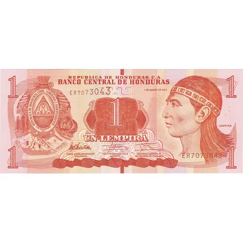| Légende de l’avers | 1 REPUBLICA DE HONDURAS. C.A. 1 BANCO CENTRAL DE HONDURAS REPUBLICA DE HONDURAS, LIBRE, SOBERANA E INDEPENDIENTE 15 DE SEPTIEMBRE 1821 LEMPIRA UN LEMPIRA (Translation: 1 REPUBLIC OF HONDURAS. AC 1 CENTRAL BANK OF HONDURAS REPUBLIC OF HONDURAS, FREE, SOVEREIGN AND INDEPENDENT SEPTEMBER 15 1821 LEMPIRA A LEMPIRA) |