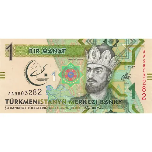 (Translation: One Manat, Central Bank of Turkmenistan, This banknote is valid for all types of payments)
