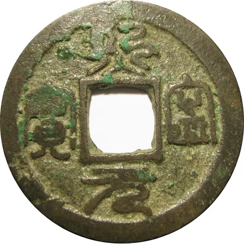 | Descripción del anverso | Four Kanji in seal script around square hole (read clockwise) |