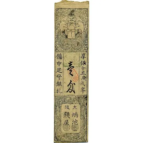 (Translation: Kyōhō fifteenth Fire Dog year One Monme Bitchū Ashimori silver bill Osaka Kōnoike)