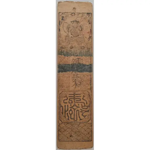 | Описание лицевой стороны | Deity Inscriptions reads from right to left, 摂州尼崎札 SESSHŪ AMAGASAKI SATSU Vertical inscriptions, 銀壹匁 GIN ICHI-MONME Seal Script Waves Motifs |