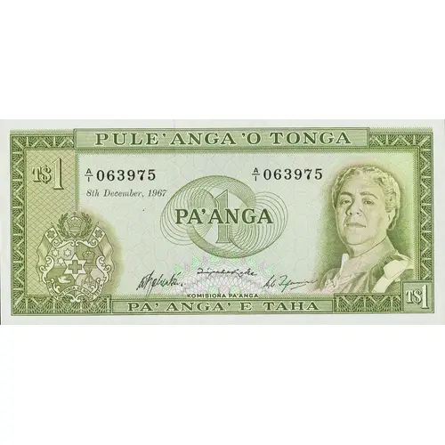 PULE` ANGA `O TONGA 8th December, 1967 1 PA`ANGA KOMISIONA PA`ANGA PA` ANGA `E TAHA (Translation: Government of Tonga December 8th., 1967 1 Pa`anga Commissioners of amount One Pa`anga) |