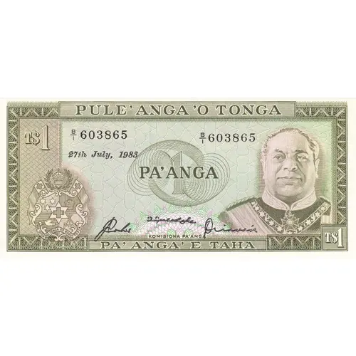 PULE` ANGA `O TONGA T$1 27th July, 1983 PA` ANGA KOMISIONA PA`ANGA PA` ANGA` E TAHA (Translation: Government of Tonga July 27th., 1983. Commissioners of amount One Pa`anga) |