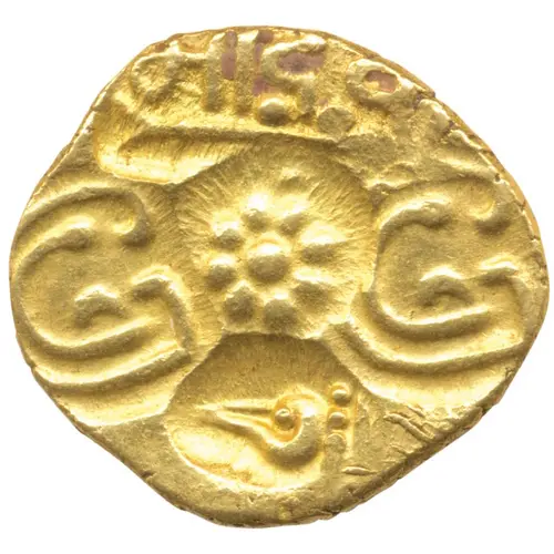 | Descripción del anverso | Five punches - Lotus in centre, Shankha, Nagari legend Shri Bhillama Deva which is partly visible and two punches of Shri in Kannada |