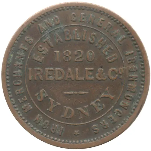 | Obverse lettering | IRON MERCHANTS AND GENERAL IRON MONGERS * ESTABLISHED 1820 IREDALE & Co. 1820 -.- SYDNEY |