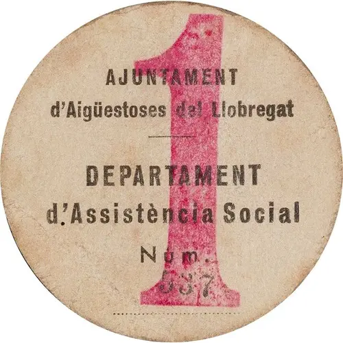 | نوشتههای روی سکه | 1 AJUNTAMENT d`Aigüestoses del Llobregat DEPARTAMENT d`Assistència Social Núm. 537 (Translation: City Council of Aigüestoses del Llobregat Department of Social Assistance) |