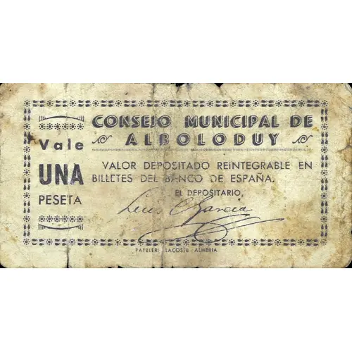 Vale UNA PESETA CONSEJO MUNICIPAL DE ALBOLODUY VALOR DEPOSITADO REINTEGRABLE EN BILLETES DEL BANCO DE ESPAÑA. PAPELERIA LACOSTE - ALMERIA (Translation: It is worth 1 Peseta Municipal Council of Alboloduy Deposited value refundable in Bank of Spain notes.) |