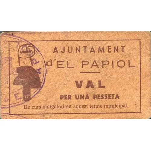 Obverse lettering AJUNTAMENT d`EL PAPIOL VAL PER UNA PESSETA De curs obligatori en aquest terme municipal