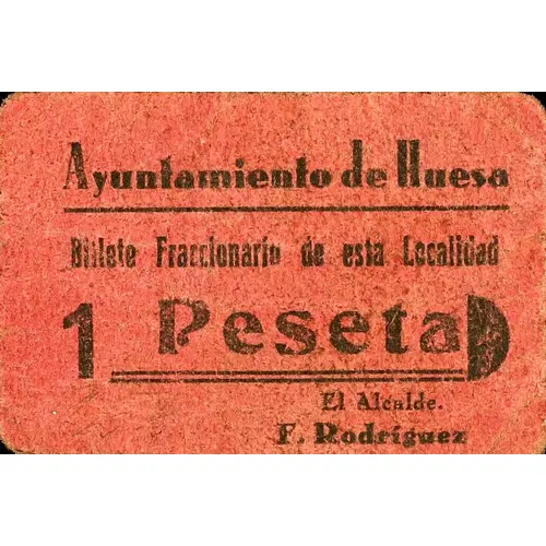 | 表面の銘文 | Ayuntamiento de Huesa Billete Fraccionario de esta localidad 1 Peseta (Translation: City Council of Huesa Fractional banknote of this location 1 Peseta) |