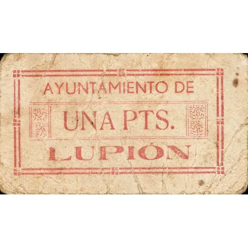 | Legenda do anverso | AYUNTAMIENTO DE LUPIÓN UNA PTS. (Translation: City Council of Lupión One Peseta) |