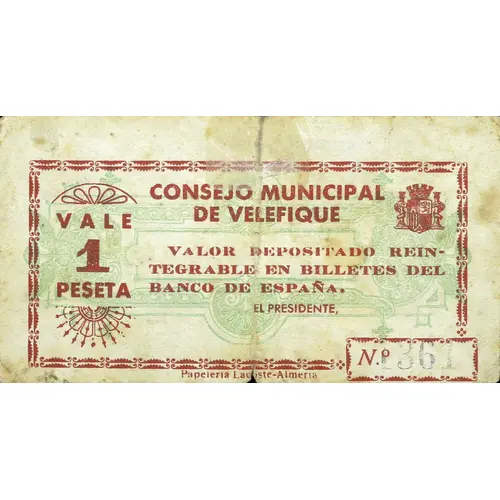VALE 1 PESETA CONSEJO MUNICIPAL DE VELEFIQUE VALOR DEPOSITADO REINTEGRABLE EN BILLETES DEL BANCO DE ESPAÑA Papeleria Lacoste - Almeria (Translation: It is worth 1 Peseta Municipal Council of Velefique Deposited value refundable in Bank of Spain notes) |