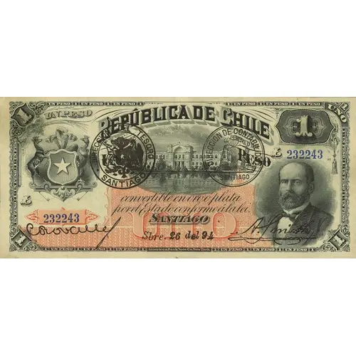 | نوشتههای روی اسکناس | 1 UN PESO UNO 1 República de Chile VALE POR Un Peso convertible en oro ó plata por el Estado conforme á la lei. Santiago Sbre. 26 del 94 American Bank Note Co., New York (Translation: 1 One Peso One 1 Republic of Chile Worth for One Peso Convertible to gold or silver by the state, accodingly to the Law. Santiago September 26, 1894 American Bank Note Co., New York) |