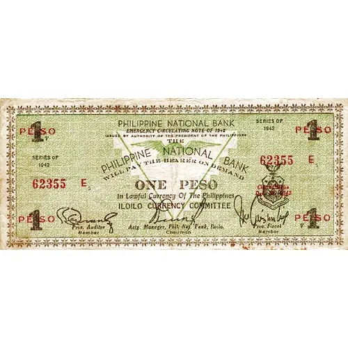 PHILIPPINE NATIONAL BANK EMERGENCY CIRCULATING NOTE OF 1942 ISSUED BY AUTHORITY OF THE PRESIDENT OF THE PHILIPPINES THE PHILIPPINE NATIONAL BANK WILL PAY THE BEARER ON DEMAND ONE PESO IN LAWFUL CURRENCY OF THE PHILIPPINES ILOILO CURRENCY COMMITTEE |