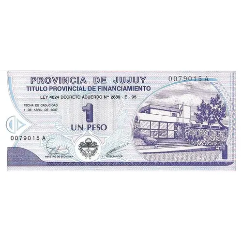 | Obverse lettering | PROVINCIA DE JUJUY TITULO PROVINCIAL DE FINANCIAMENTO LEY 4824 DECRETO ACUERDO N° 2889- E - 95 FECHA DE CADUCIDAD 1 DE ABRIL DE 2007 1 PESO (Translation: PROVINCE OF JUJUY PROVINCIAL TITLE OF FINANCING LAW 4824 DECREE AGREEMENT N° 2889- E - 95 DATE OF EXPIRY APRIL 1, 2007 1 PESO) |