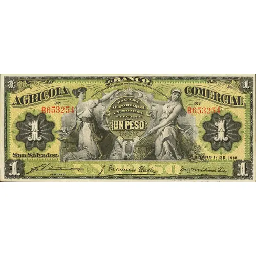 | Vorderseitenlegende | EL BANCO AGRICOLA COMERCIAL PAGARA AL PORTADOR EN MONDEDA EFECTIVA UN PESO FUNDADO EN 1895 POR LOS SENORES DON JOSE GONZALEZ A Y DON RODOLFO DUKE (Translation: The Commercial Agricultural Bank will pay the bearer in cash One Peso Founded in 1895 by Mr. Jose Gonzalez A and Mr. Rodolfo Duke) |