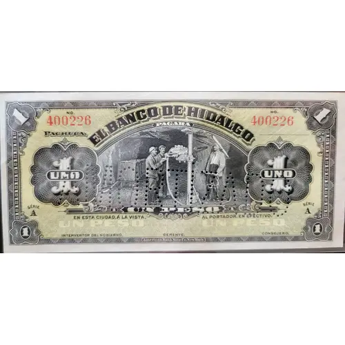 | Leyenda del anverso | El Banco de Hidalgo pagará un peso en esta ciudad, a la vista, al portador, en efectivo. (Translation: The Banco of Hidalgo will pay one peso in this city, on demand, to bearer, in cash.) |