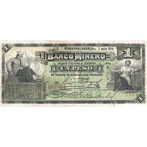 | Légende de l’avers | CHIHUAHUA, 7 Julio 1914 El BANCO MINERO pagará á la vista al portador. 1 UN PESO 1 en moneda de plata del cuño Mexicano. SÉRIE E (Translation: Chihuahua, 7 July 1914 The Mining Bank Will pay at sight to the bearer One Peso in silver coin of the Mexican mint. Series E) |