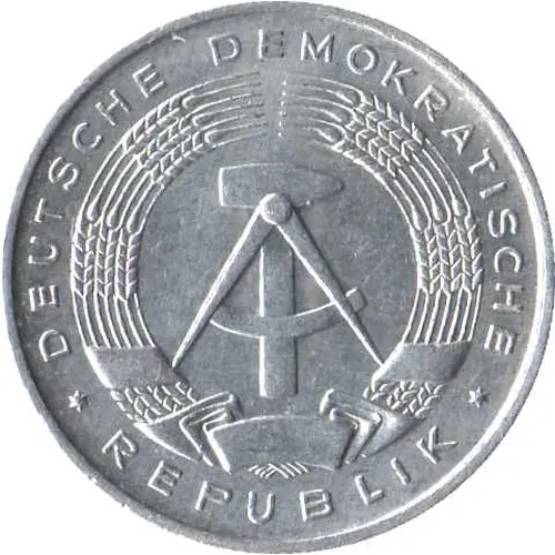 | Ön yüz açıklaması | State emblem of the German Democratic Republic (a hammer and a compass, surrounded by a ring of ears with a ribbon displaying the flag colors: black, red and yellow) with the country name around the rim. |