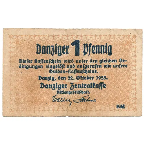(Translation: Danziger 1 Pfennig This banknote is exchanged under the same conditions as our Gulden-banknotes. Danzig, October 22nd, 1923 Danziger central bank Stock corporation) |