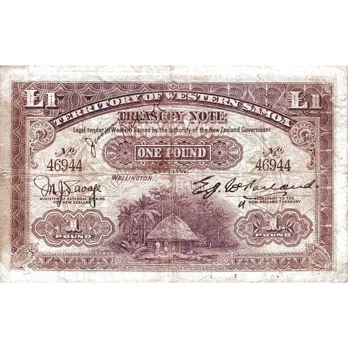 | Leyenda del anverso | TERRITORY OF WESTERN SAMOA TREASURY NOTE Legal tender in Western Samoa by the authority of the New Zealand Government. ONE POUND |