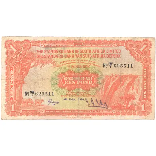 THIS NOTE IS SECURED BY DEPOSITS WITH THE GOVERNMENT - THE STANDARD BANK OF SOUTH AFRICA LIMITED DIE STANDARD BANK VAN SUID AFRIKA BEPERK - PROMISES TO PAY BEARER ON DEMAND BELOOF OP AANVRAAG TE BETAAL AAN TOONDER AT TE WINDHOEK - ONE POUND EEN POND - VALUE RECEIVED WAARDE ONTVANG - BY ORDER OF THE BOARD OF DIRECTORS OP LAS VAN DIE RAAD VAN DIREKTEURE - HIERDIE NOOT IS GEDEKDEUR DEPOSITO`S BY DIE REGERING - 1 POND 1 PFUND 1 1 -WATERLOW & SONS LIMITED, LONDON |
