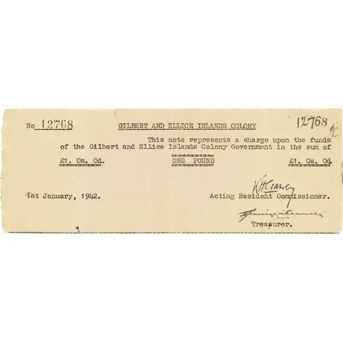 | نوشتههای روی اسکناس | GILBERT AND ELLICE ISLANDS COLONY THIS NOTE REPRESENT A CHARGE UPON THE FUNDS OF THE GILBERT AND ELLICE ISLANDS COLONY GOVERNMENT IN THE SUM OF ONE POUND |