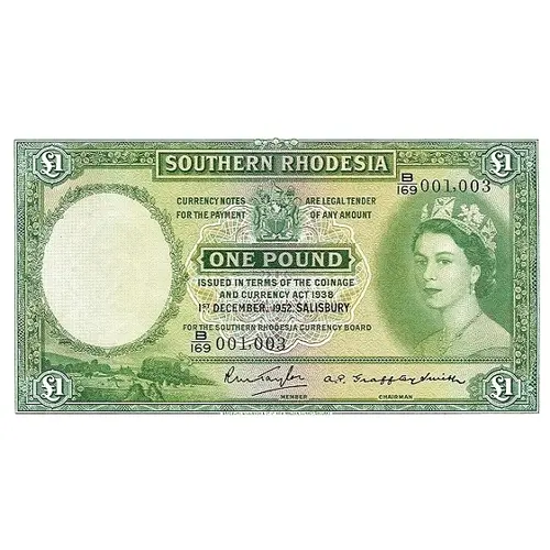 Obverse lettering SOUTHERN RHODESIA CURRENCY NOTES ARE LEGAL TENDER FOR THE PAYMENT OF ANY AMOUNT ONE POUND ISSUED IN TERMS OF THE COINAGE AND CURRENCY ACT 1938 FOR THE SOUTHERN THODESIA CURRENCY BOARD