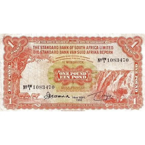 THIS NOTE IS SECURED BY DEPOSITS WITH THE GOVERNMENT - THE STANDARD BANK OF SOUTH AFRICA LIMITED DIE STANDARD BANK VAN SUID AFRIKA BEPERK - PROMISES TO PAY BEARER ON DEMAND BELOOF OP AANVRAAG TE BETAAL AAN TOONDER AT TE WINDHOEK - ONE POUND EEN POND - VALUE RECEIVED WAARDE ONTVANG - BY ORDER OF THE BOARD OF DIRECTORS OP LAS VAN DIE RAAD VAN DIREKTEURE - HIERDIE NOOT IS GEDEKDEUR DEPOSITO`S BY DIE REGERING - 1 POND 1 PFUND 1 1 -WATERLOW & SONS LIMITED, LONDON |