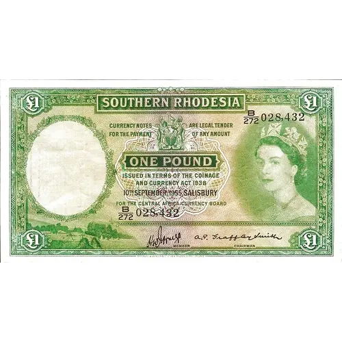 SOUTHERN RHODESIA CURRENCY NOTES ARE LEGAL TENDER FOR THE PAYMENT OF ANY AMOUNT ONE POUND ISSUED IN TERMS OF THE COINAGE AND CURRENCY ACT 1938 FOR THE SOUTHERN THODESIA CURRENCY BOARD |