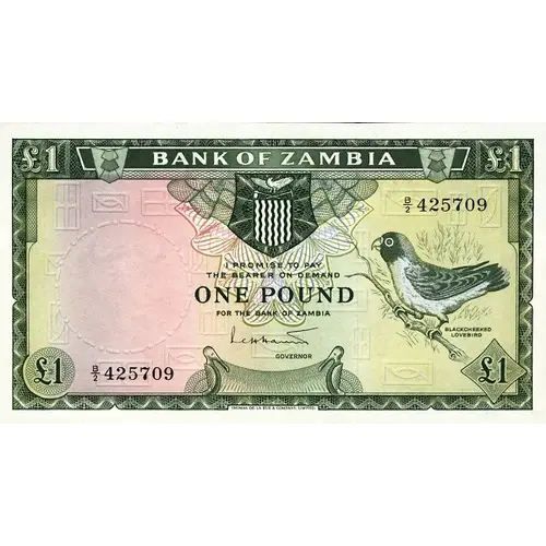 BANK OF ZAMBIA I PROMISE TO PAY THE BEARER ON DEMAND ONE POUND FOR THE BANK OF ZAMBIA BLACKCHEEKED LOVEBIRD |