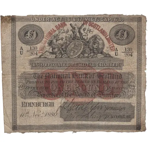 | Légende de l’avers | THE NATIONAL BANK OF SCOTLAND LIMITED The National Bank of Scotland Promise to pay the Bearer on demand at the office here ONE POUND Sterling By order of the Board of Directors Edinburgh |