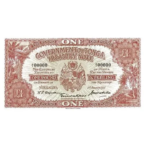 | نوشتههای روی اسکناس | £1 Government of Tonga Treasury Note The Government of Tonga Promises to Pay the Bearer One Pound sterling on demand at the treasury NUKUALOFA Thomas de la Rue, London |