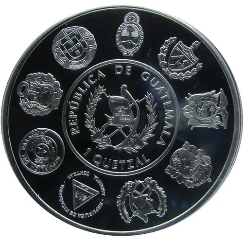 | Obverse description | Coat of arms of Guatemala with legend at top and value at bottom. Surrounded by the nine arms from the countries that minted coins for these 10th series. |