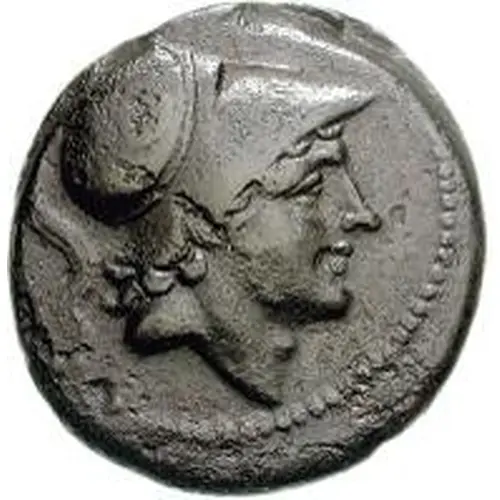 Descripción del anverso Minerva or Mars wearing Corinthian helmet facing right.