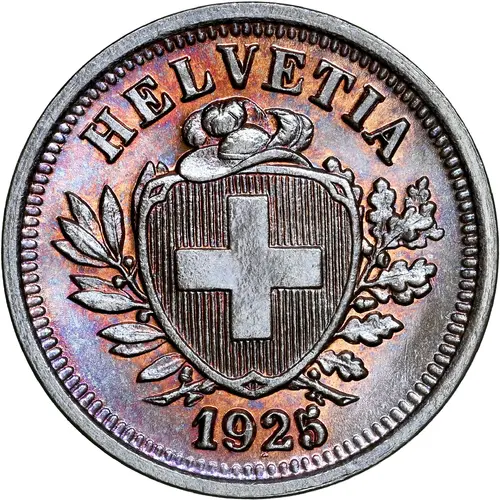 Ön yüz açıklaması Coat of arms of Switzerland on ornate shield. Oak branch to the right. Laurel branch to the left. Hat with feather above.