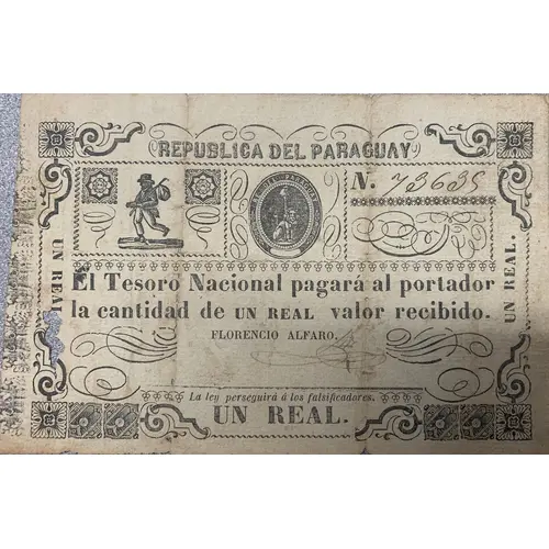 | Obverse lettering | REPUBLICA DEL PARAGUAY UN REAL. El Tesoro Nacional pagará al portador la cantidad de UN REAL valor recebido. FLORENCIO ALFARO La ley perseguirá á los falsificadores. UN REAL. (Translation: Republic of Paraguay One Real. The National Treasury pay to bearer the amount of One Real amount received. The law prosecute counterfeiters and their accomplices. One Real.) |