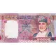 Multicolour print. Predomenantly purple and green. The national emblems of Oman. It is an insignia consisting of a khanjar inside its sheath that is superimposed upon two crossed swords. Centered, on background, is the Omani incense burner. To the right a colored portrait of Sultan Qaboos bin Said Al Said. |
