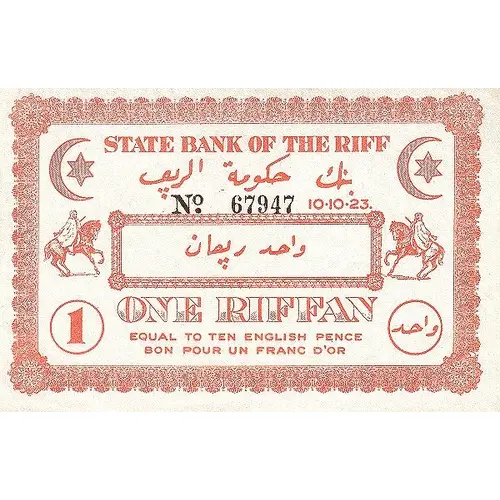 STATE BANK OF THE RIFF بنك الحكومة الريڥ واحد ريڥان ONE RIFFAN EQUAL TO TEN ENGLISH PENCE BON POUR UN FRANC D`OR |