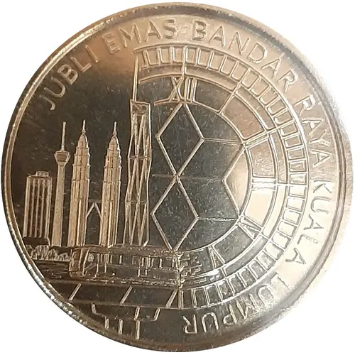The obverse features images of the Kuala Lumpur skyline and modern transportation juxtaposed against the clock face of Bangunan Sultan Abdul Samad. This symbolises the passage of time since the granting of city status to Kuala Lumpur in 1972 which saw the city progress and develop into a modern city. |
