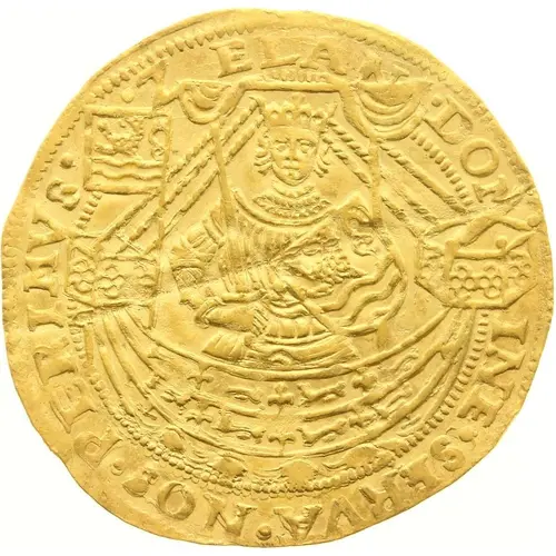 King in ship facing, holding sword with right hand and shield with provincial arms in left hand; on stern, banner with rampant lion left. |