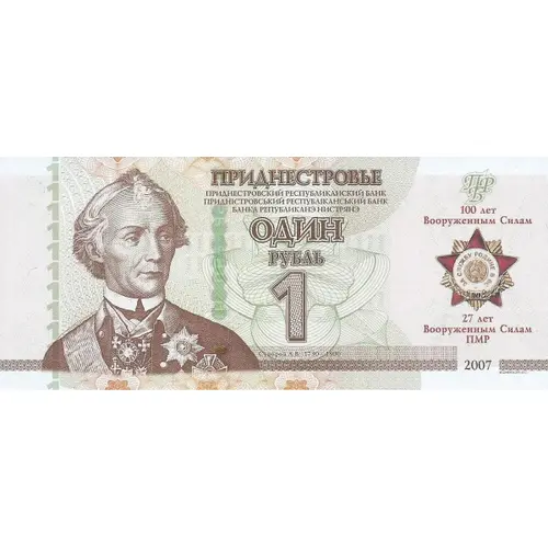 (Translation: Transnistria, Transnistrian Republican Bank, One Ruble, 100 years of armed forces, 27 years of Transnistrian armed forces)